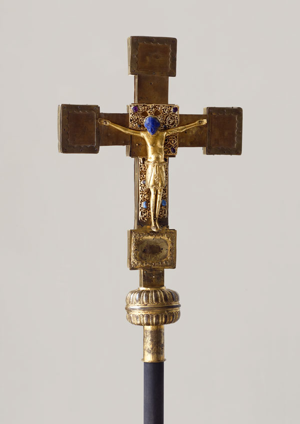 Kreuz Herimanns und Idas, Werden oder Köln, 2. Viertel 11. Jh., Corpus: Bronze, gegossen, ziseliert, vergoldet, mit einem Lapislazuliköpfchen aus dem 1. Jh.; Kreuz: Kupfer graviert, vergoldet, Bergkristall (Rückseite) über Holzkern; Filigran auf der Vorderseite: Anfang 13. Jh.; barocker Knauf und Kartusche: Kupfer getrieben und vergoldet